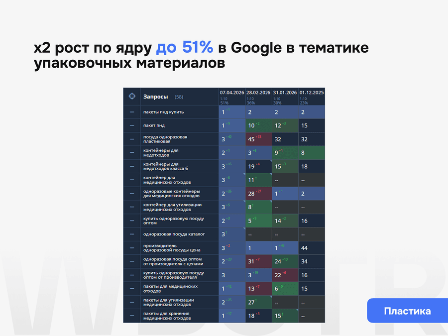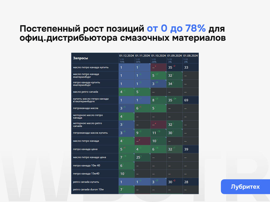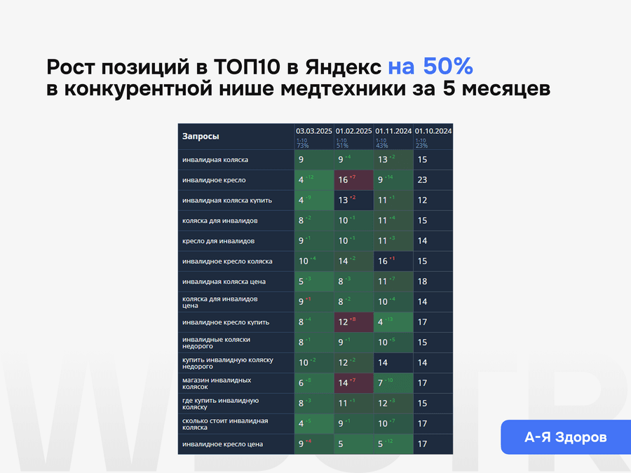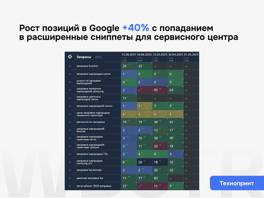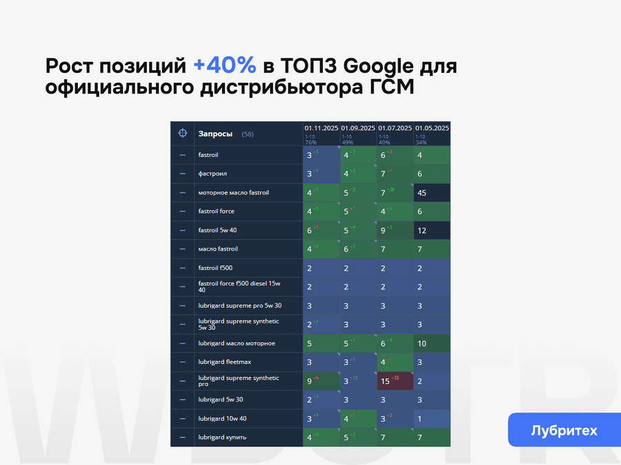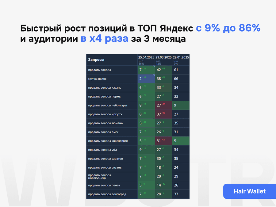 Мы не даём формальных гарантий по позициям — это запрещено политикой поисковиков. Но мы обеспечиваем контроль за результатами, прозрачную аналитику и корректировку стратегии при необходимости.